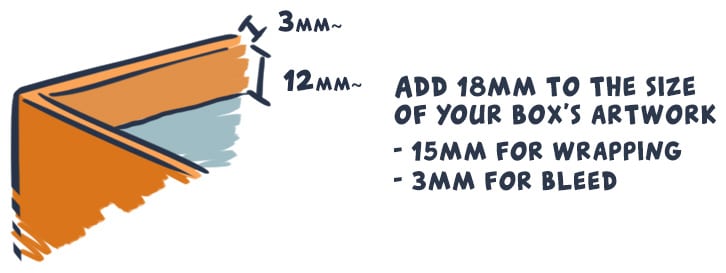 For game boxes, the printed sheets also wrap around the sides of the box. Similar to game boards, this hides the raw cardboard material. Therefore, they need to have 18mm of bleed on every size. 15 millimeters of bleed is reserved for the wrap around part. Then the remaining 3mm is the standaard bleed. Dieline files will be separated from the artwork. Because the department that makes the dieline mold is separated from the printing department. For the dieline files, this can either be in individual dielines PDF files. Or as a spot layer file.