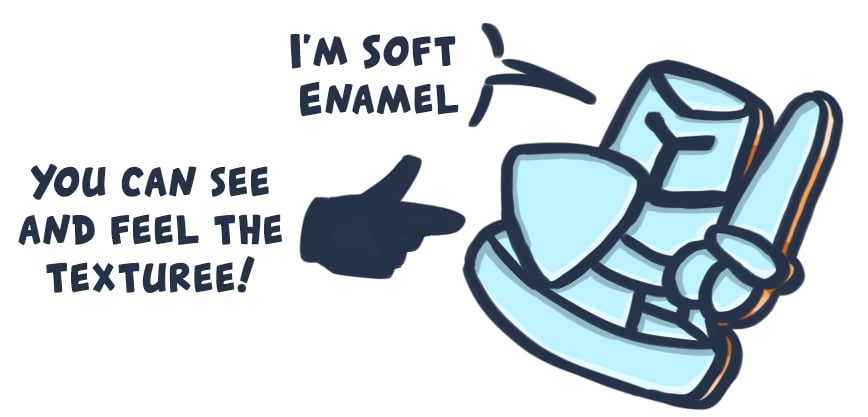 Soft Enamel Pins have a textured surface and allow for a higher level of detail. Soft enamel pins are made from die-struck iron metal that is then electroplated, and optionally coated with epoxy. They tend to come out a bit thinner than hard enamel pins, but are slightly lower in price.